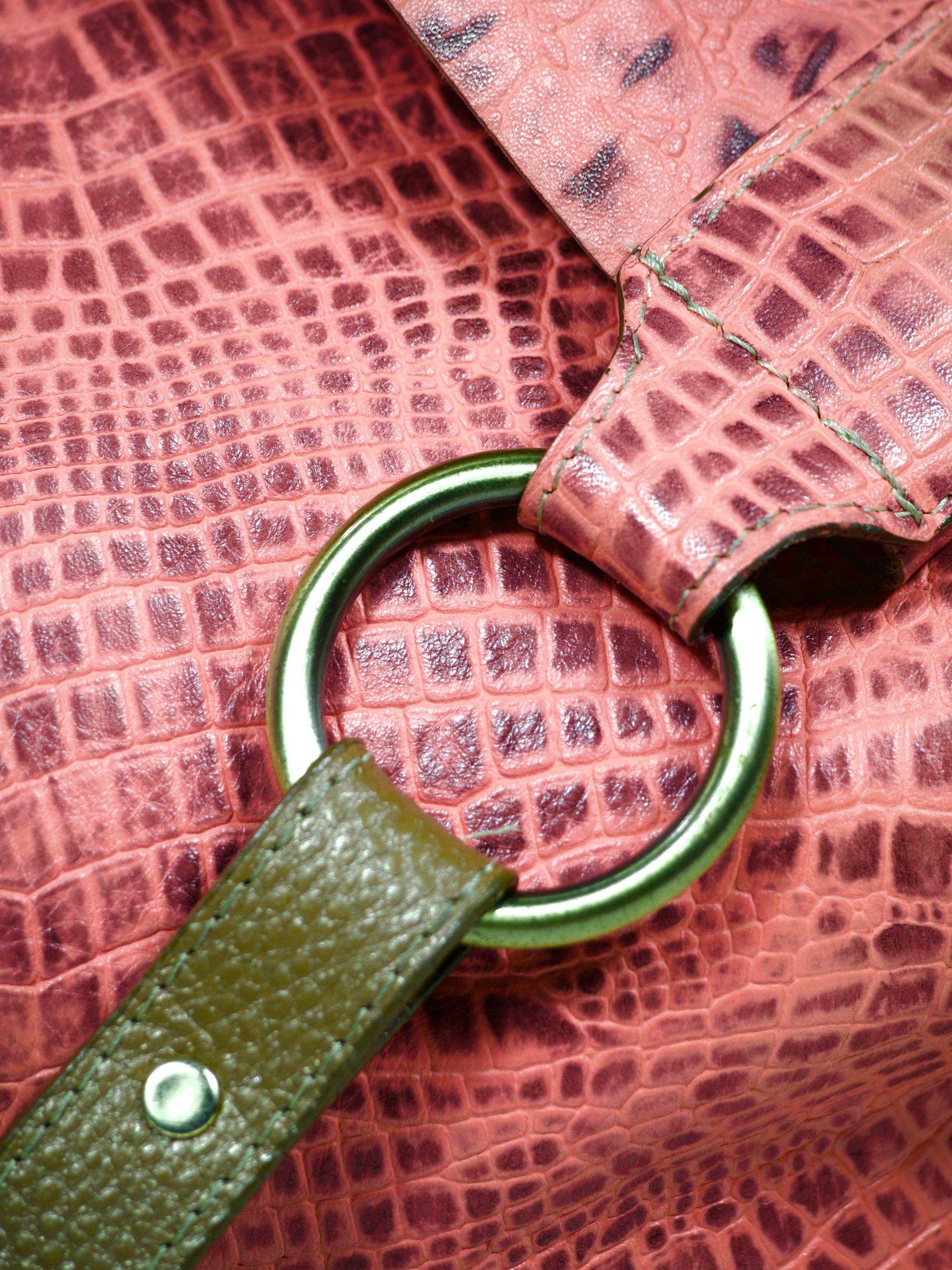 - Color: Rosado empolvado con matices rojizos + correa verde oliva en cuero liso.