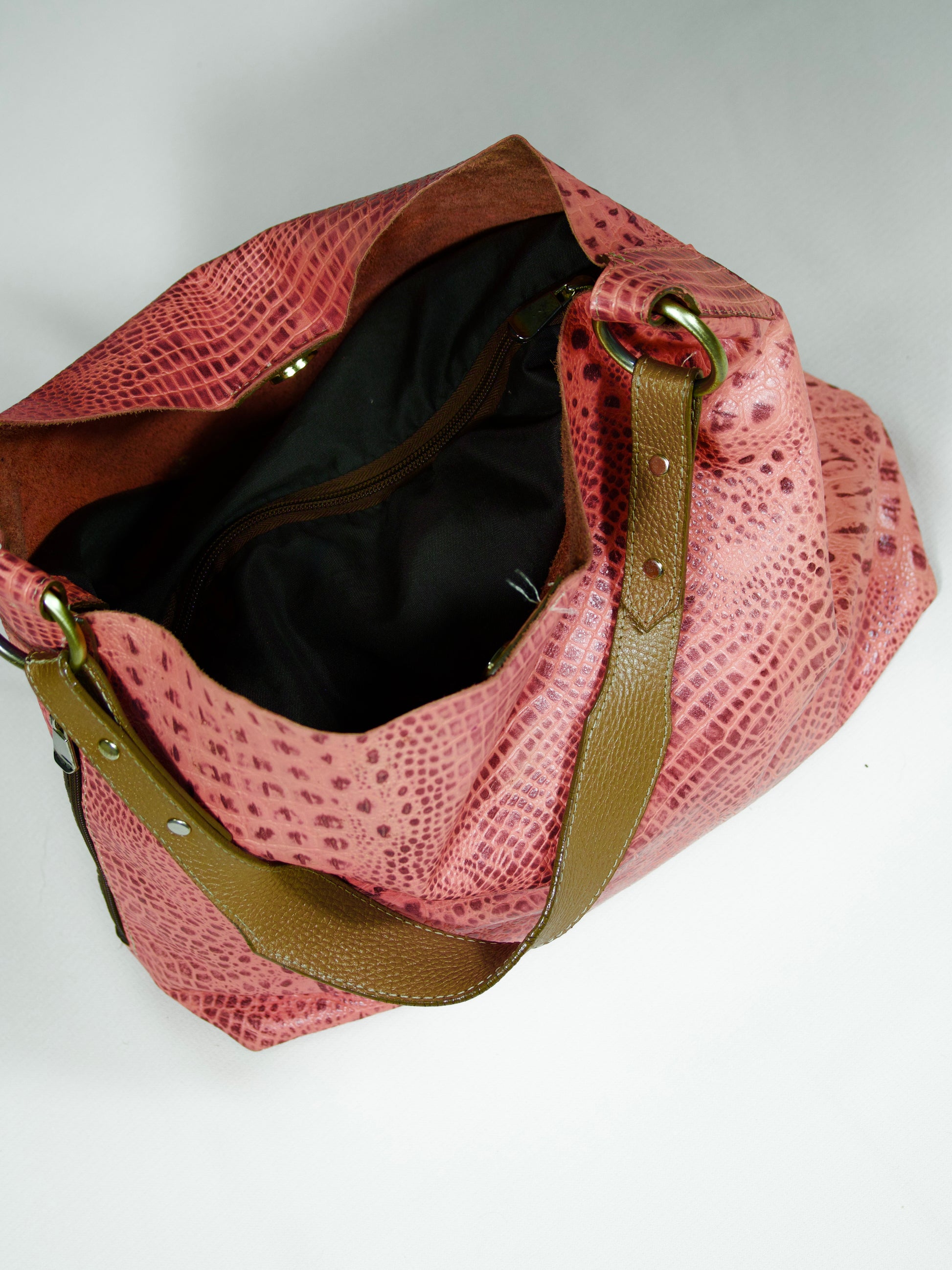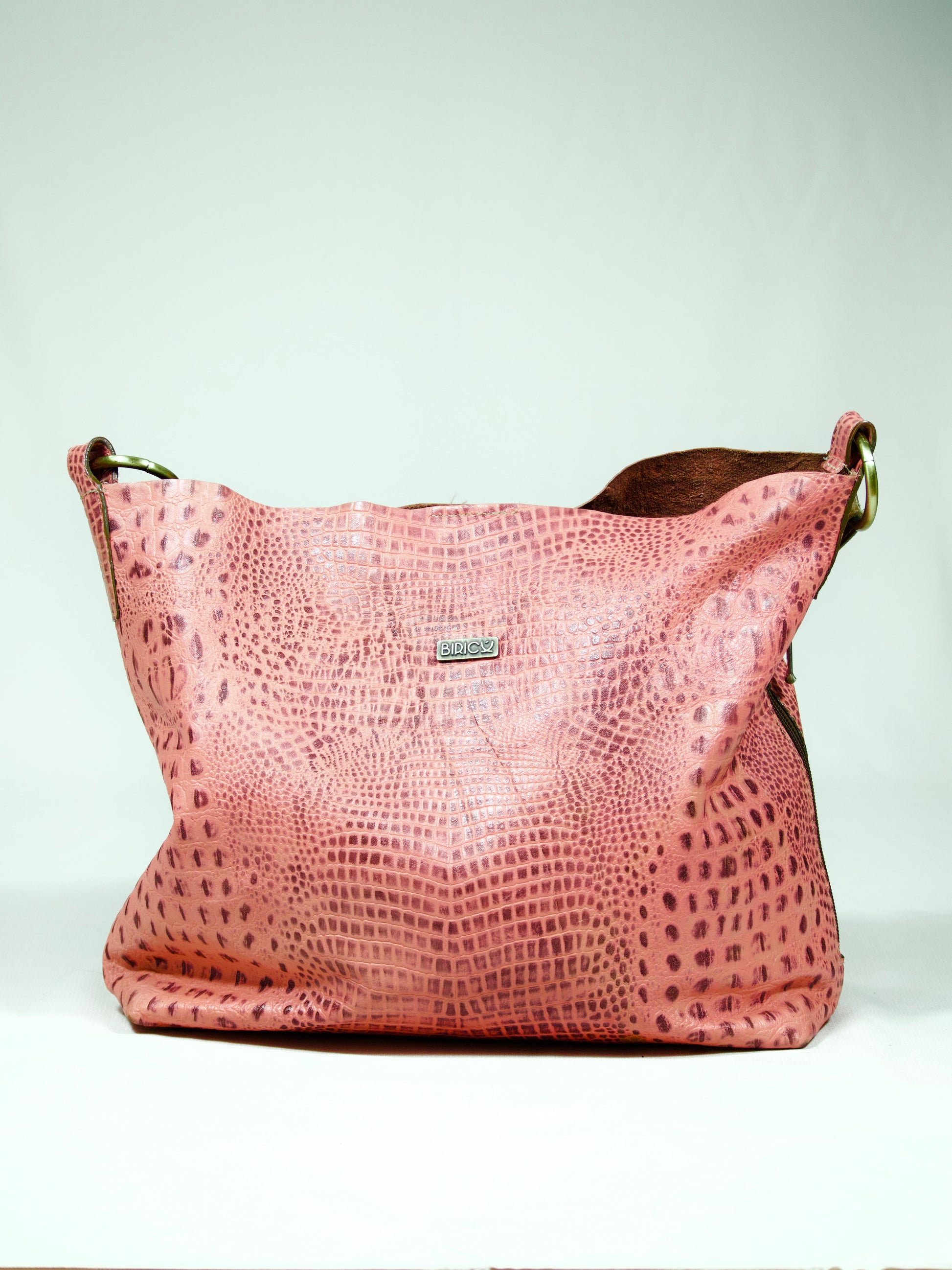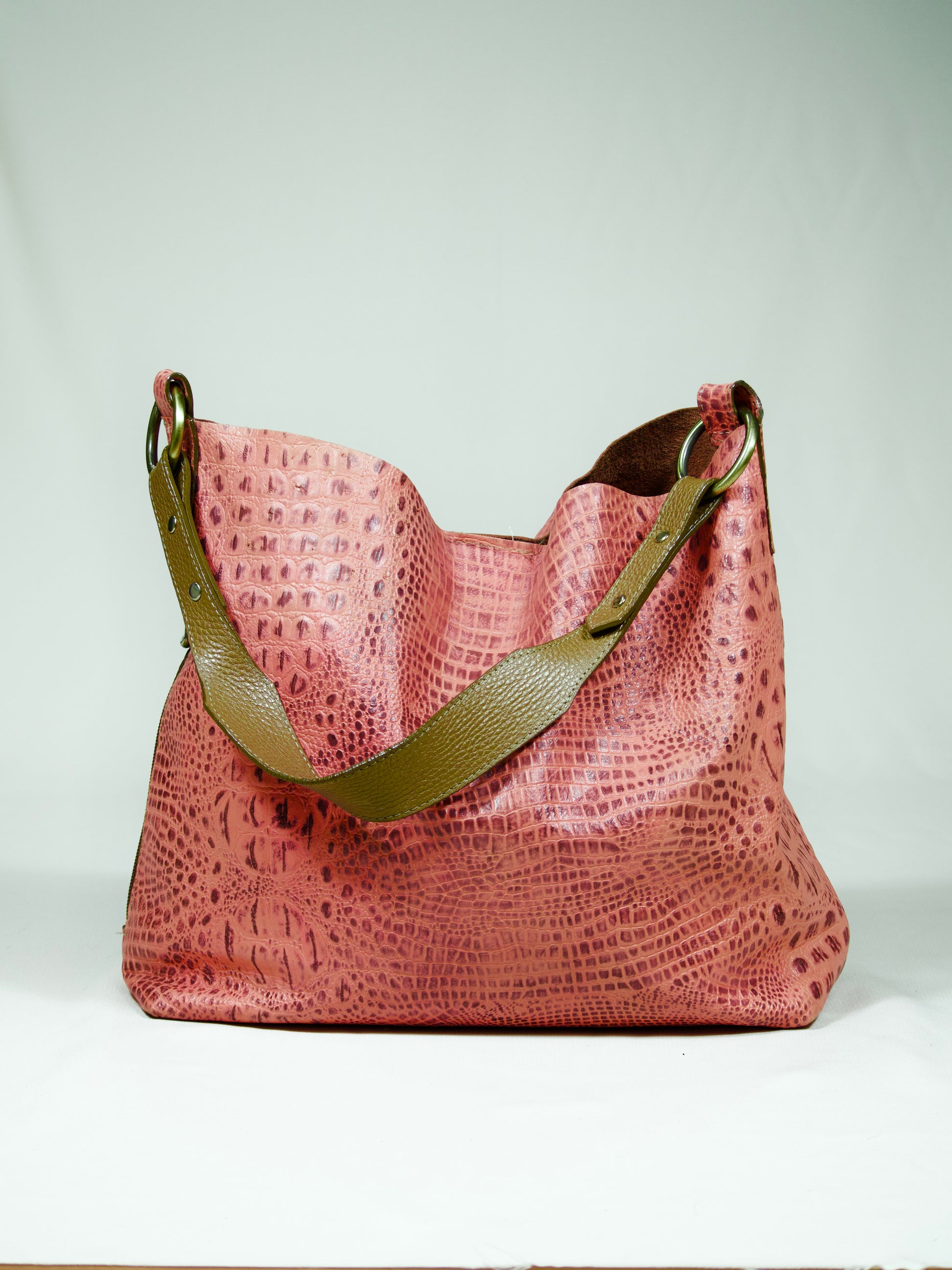 Fuerte, femenina y libre. Su versatilidad permite adaptarse al tamaño que necesitas. Así es esta versión del bolso tipo hobo de Biricú, confeccionado en cuero liviano y docil con textura tipo reptil en tono rosado cálido, y contrastado con una correa ancha verde oliva. Ideal para quienes combinan lo bohemio con lo audaz.