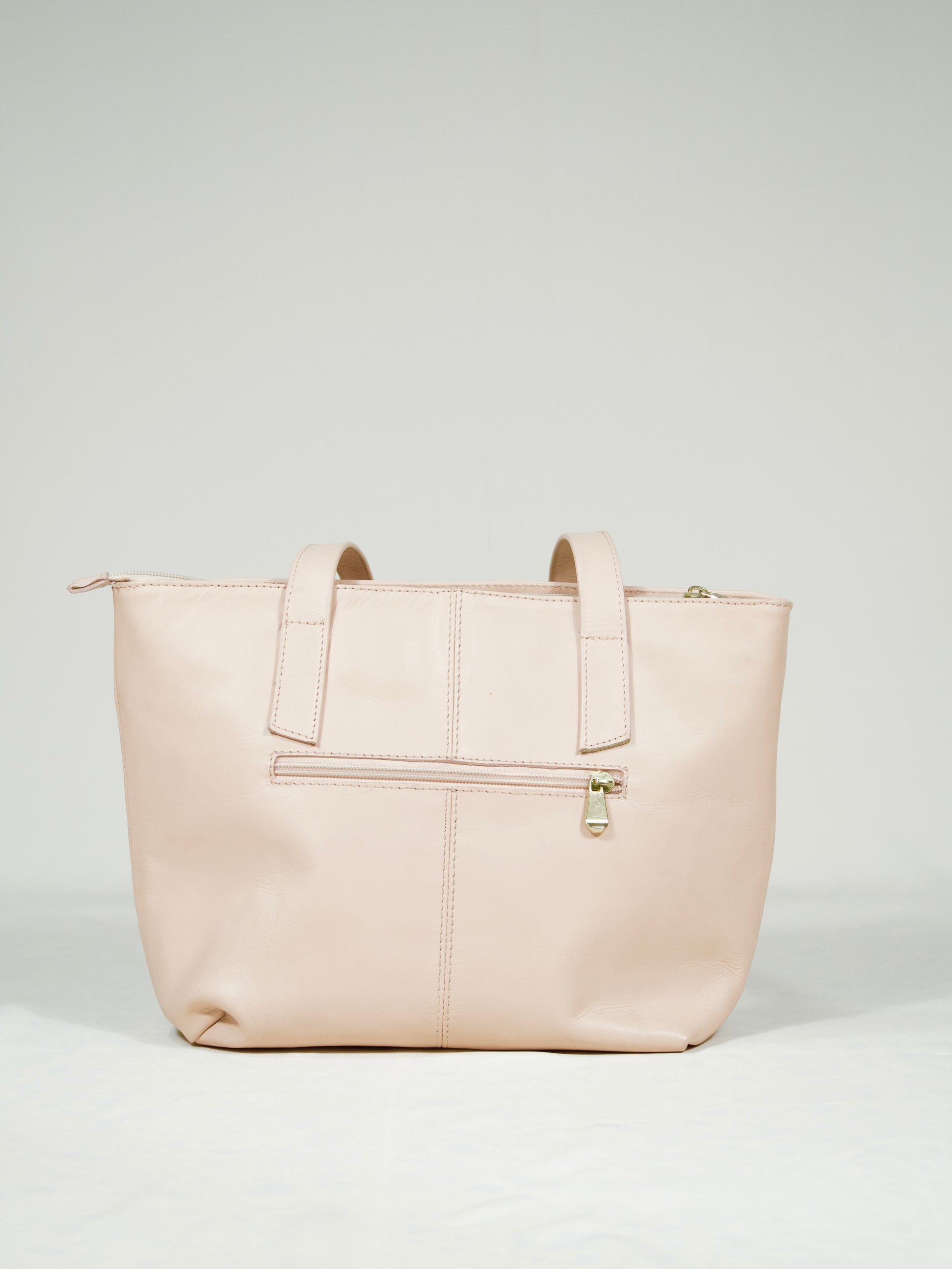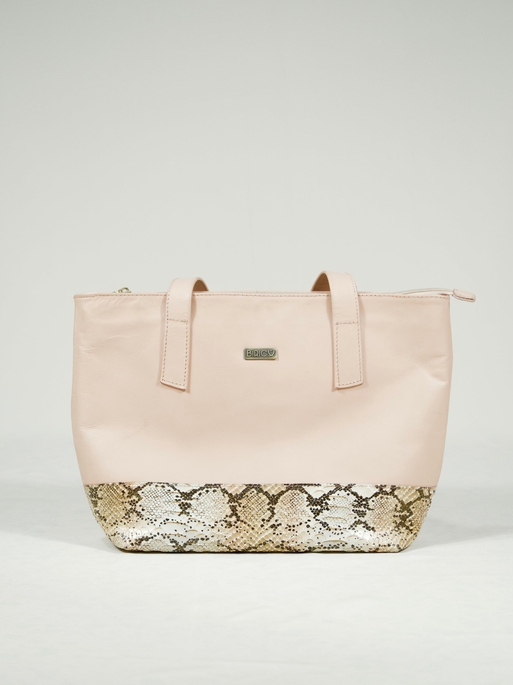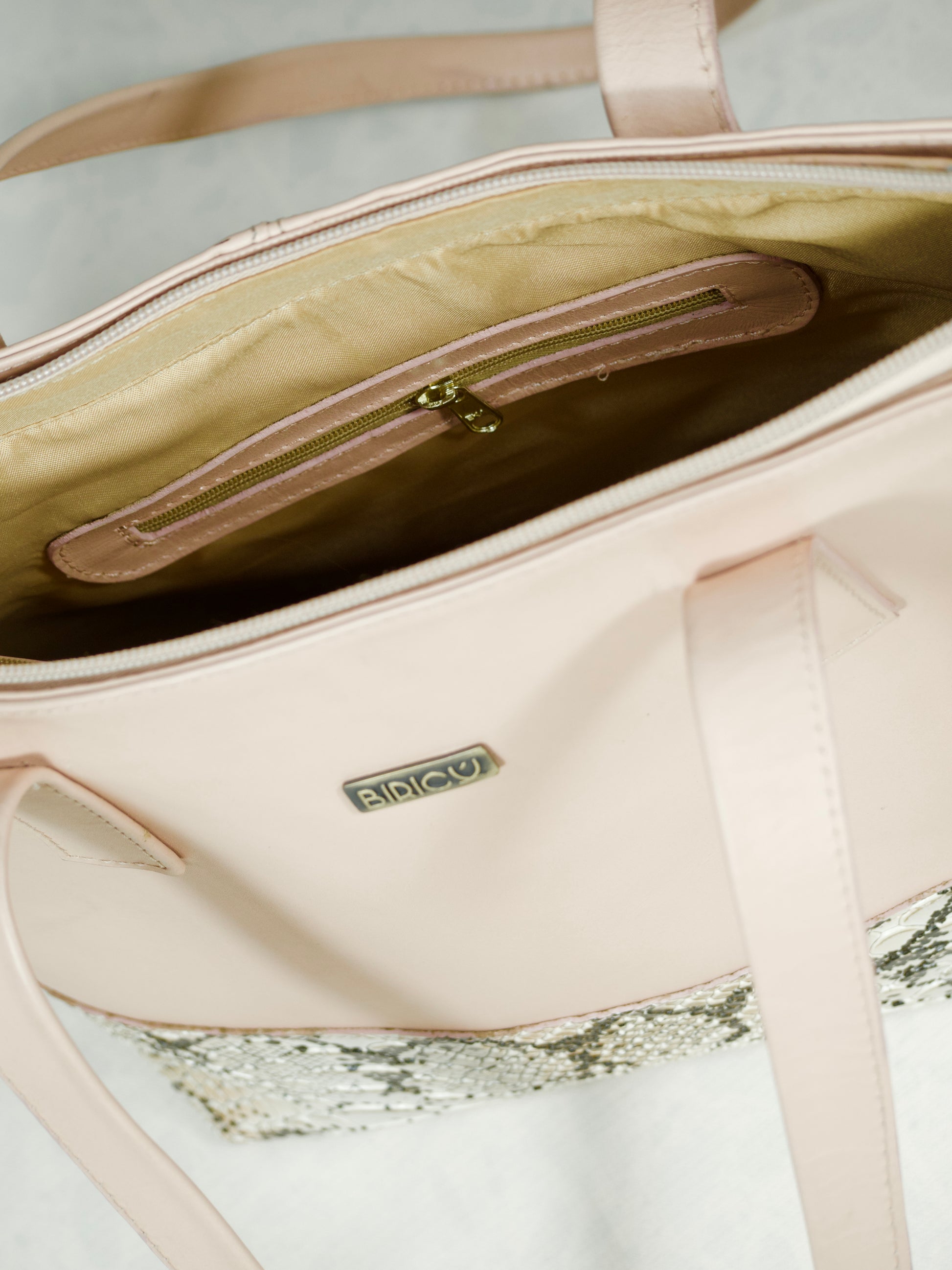 Este elegante bolso tote combina la suavidad del cuero autentico rosa pálido con un impactante detalle en textura de reptil en la base, logrando un equilibrio perfecto entre delicadeza y carácter. Su silueta amplia y estructurada lo convierte en el compañero ideal para el día a día, manteniendo el estilo sin renunciar a la funcionalidad.