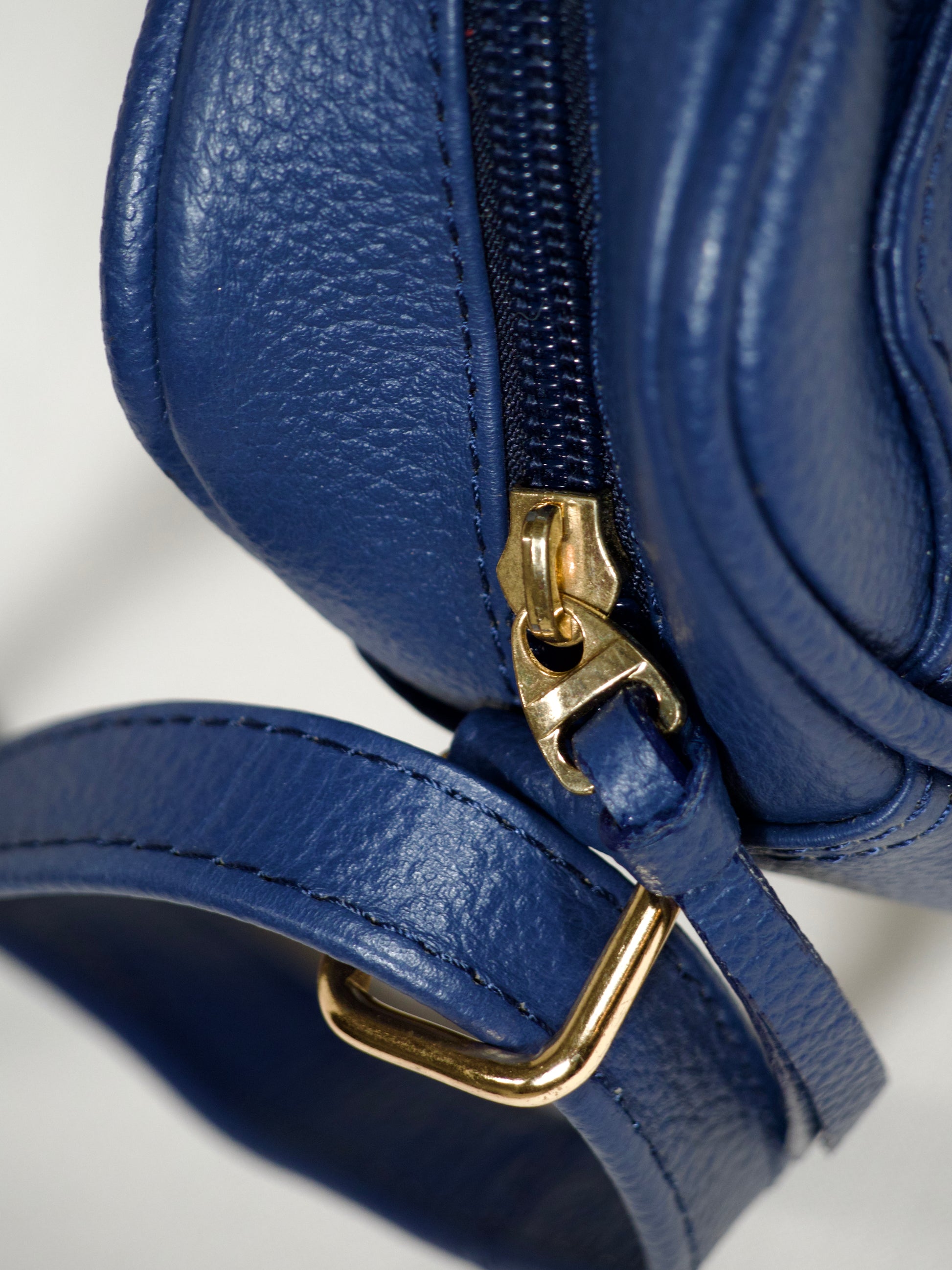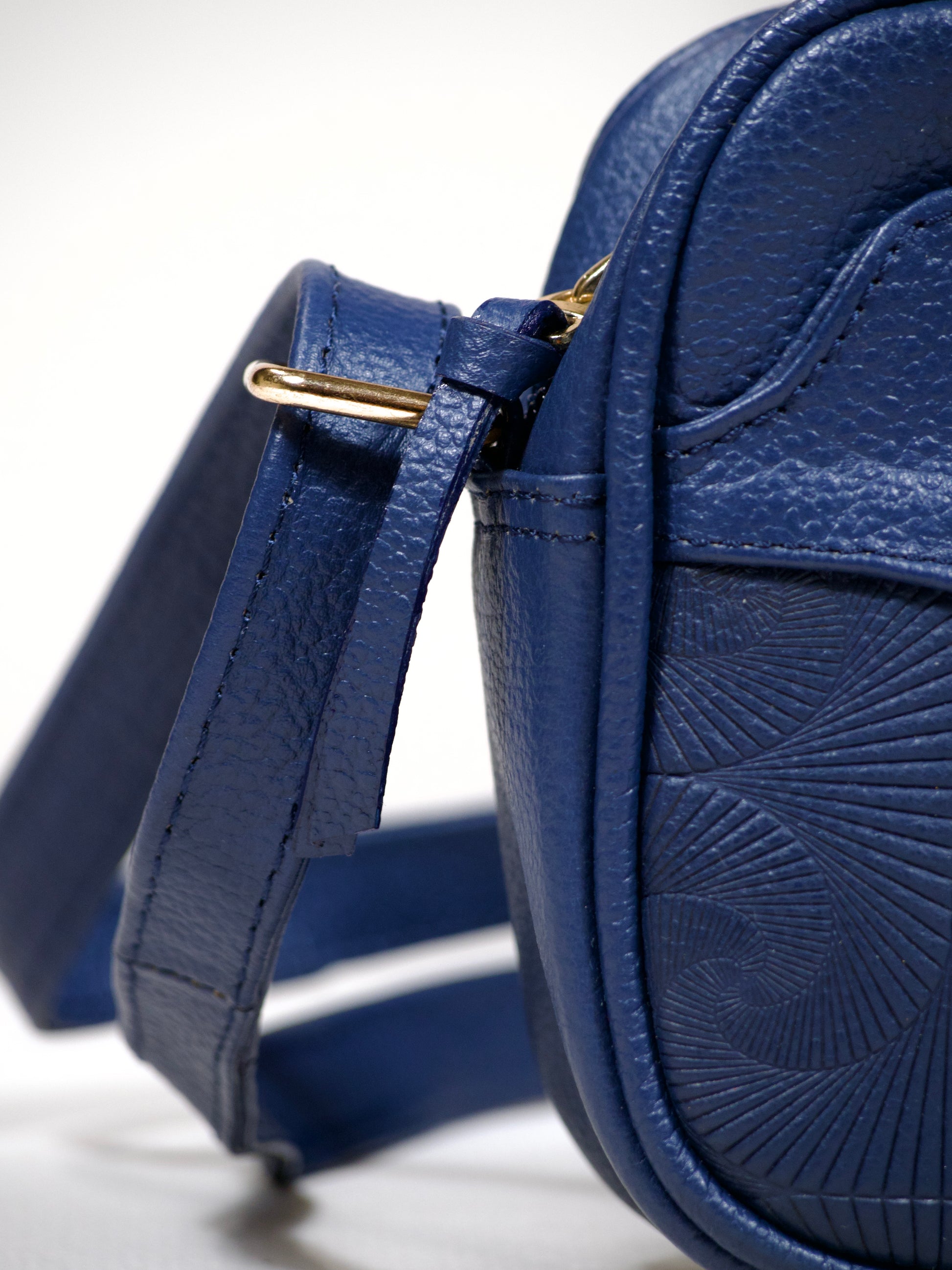 Minimalismo con identidad. Esta mini crossbody de cuero azul oscuro incorpora un diseño grabado en espirales geométricas que le dan un toque sofisticado y moderno, sin perder su esencia artesanal. Compacta, funcional y con estilo atemporal.